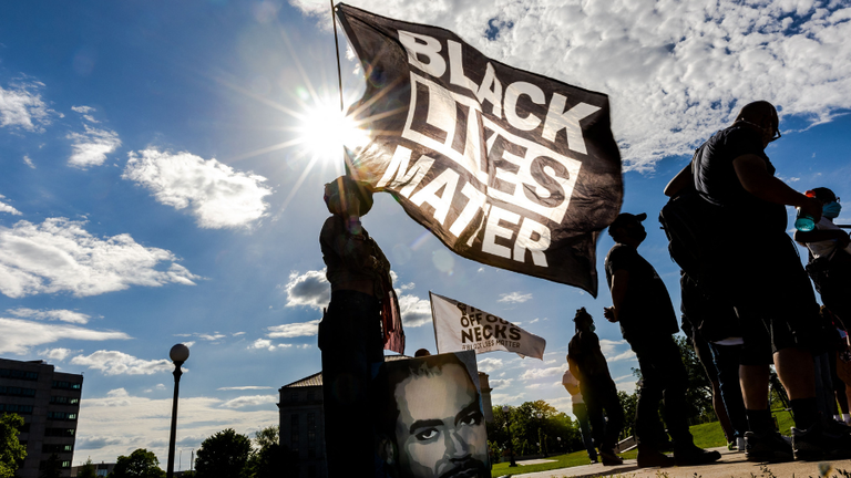 TOPSHOT - A woman holds a Black Lives Matter flag during an event in remembrance of George Floyd and to call for justice for those who lost loved ones to the police violence outside the Minnesota State Capitol on May 24, 2021 in Saint Paul, Minnesota.