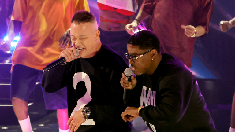 Doug E. Fresh kicked off the "Hip-Hop 50" finale of performances with the hit track "Teach Me How To Dougie." A number of break dancers lit up the stage before Kid 'N Play hit the mic. The duo donned "2 Hype" sweatshirts as they performed "Gittin Funky."
