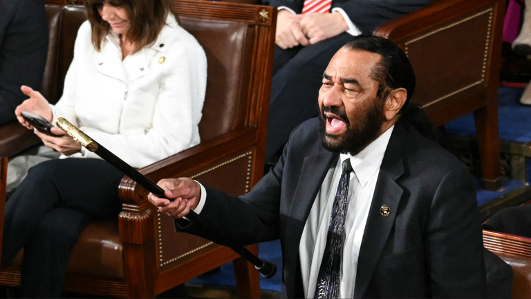 Trump began his speech touting the "accomplishments" of his administration, garnering applause and "USA" chants from Republican lawmakers and boos from Democrats. Green stood in the aisle and waved his cane at the president in protest of the speech.