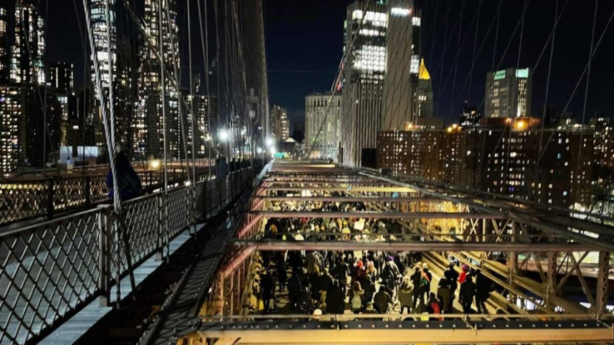 The march started around 5 p.m. outside the Barclays Center with a short program of speakers, the crowd then marched across the Brooklyn Bridge. Police blocked off the road from the bridge to City Hall Park.